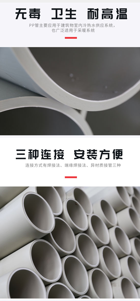 产品卖点:PP管的特点是不锈蚀、耐磨损、不结垢、减小振动和噪声、防冻裂(超过-20℃的低温下pp管产生冻裂,高温的工作环境只要超过70℃产生分解,使用温度在-20℃到70℃)、防结露,热损失少、安装简单、使用寿命长。